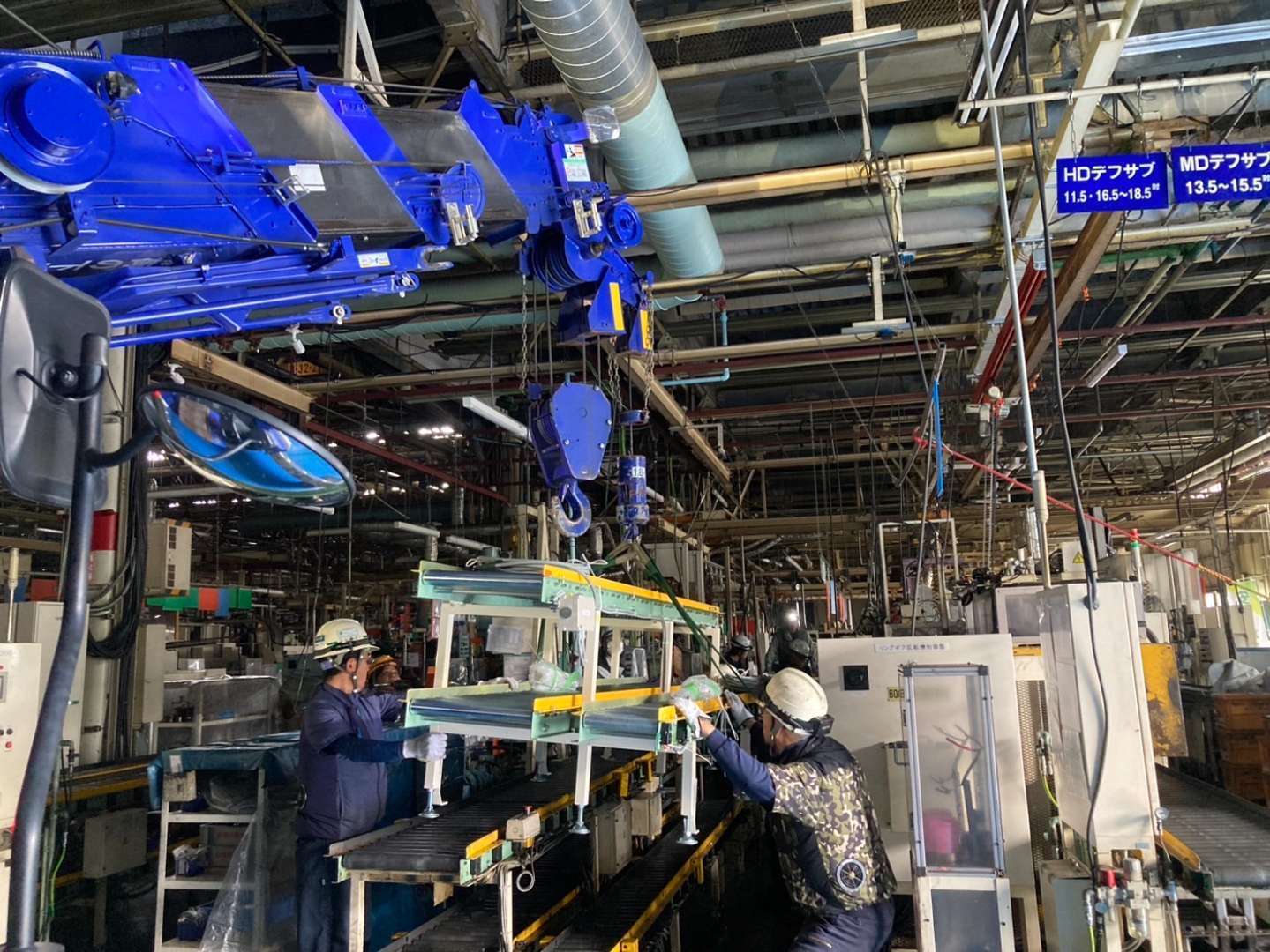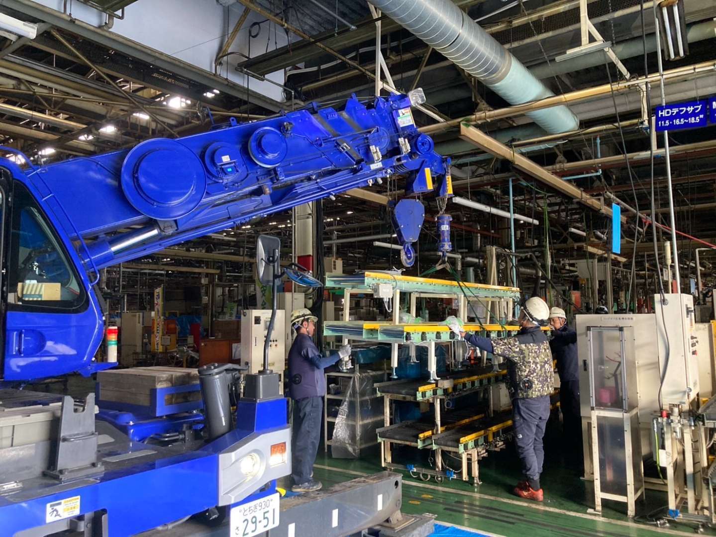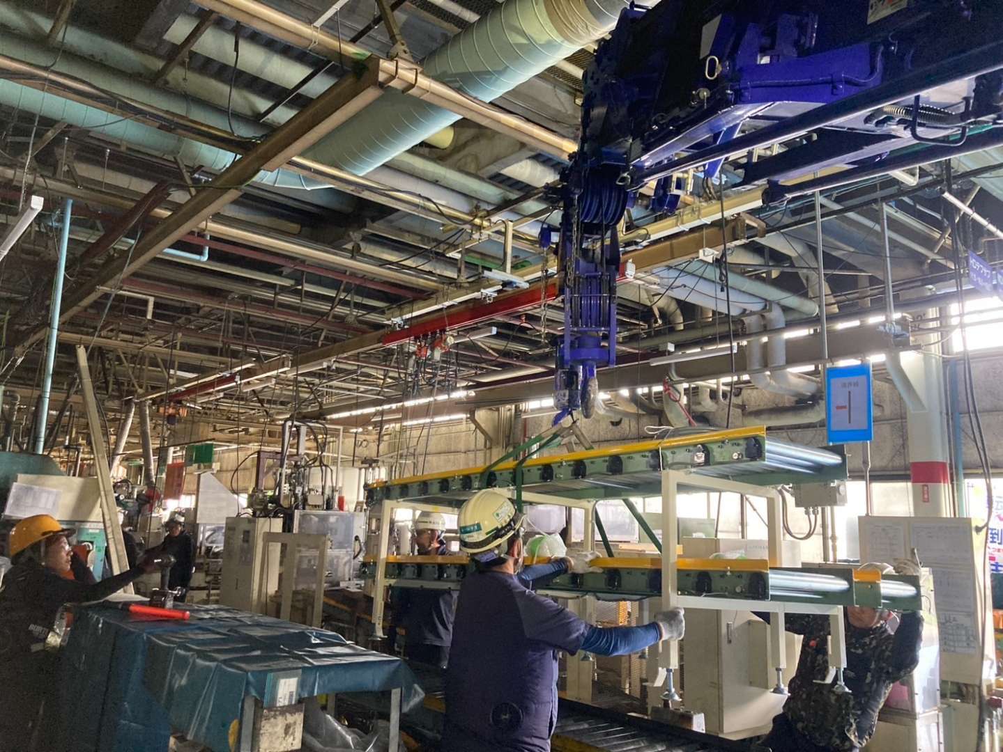 今回の工事では、既存ラインの大型コンベアをクレーンで慎重に吊り上げ、新しい設置場所へと移設いたしました。製造設備が稼働する工場内での作業は、安全管理と精密な操作が不可欠です。弊社の経験豊富な専門スタッフが、周囲の設備や作業環境に細心の注意を払いながら、迅速かつ安全に作業を進めました。
