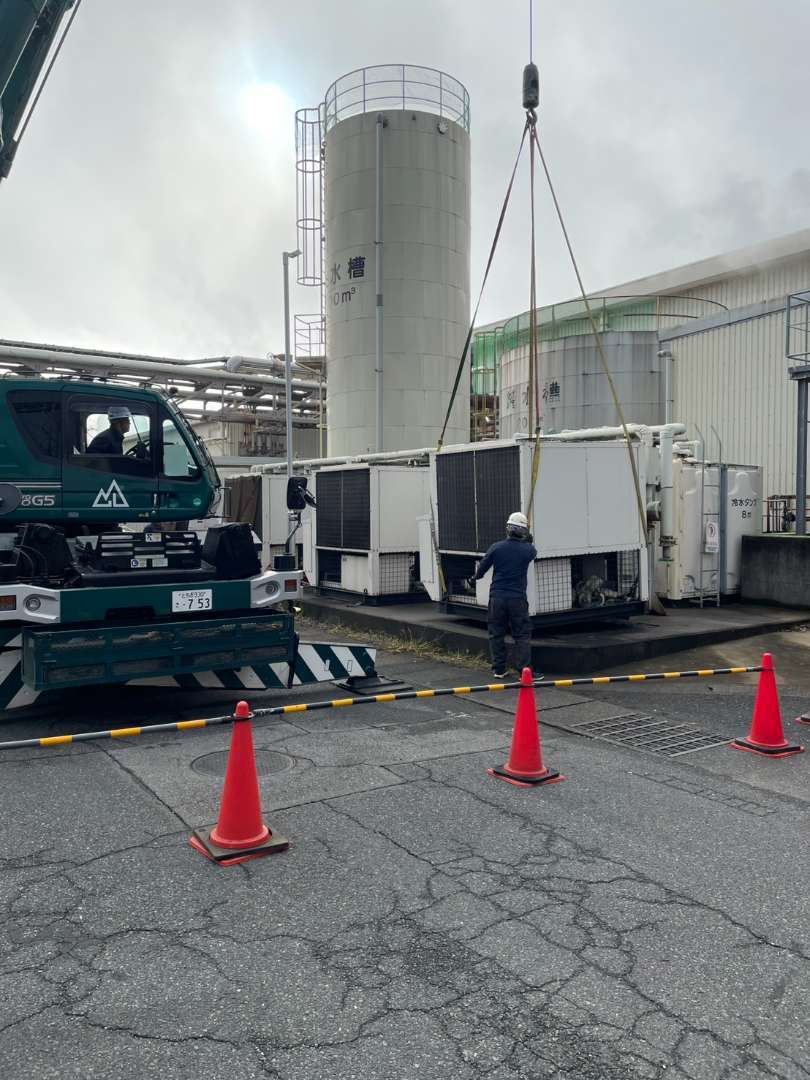 工場の生産ラインや空調に欠かせない「チラーユニット」の設備更新が必要となりました。 現場は大型の貯水タンクや配管が近接するエリアであり、操業への影響を最小限に抑えるため、「安全かつスピーディーに旧設備を撤去し、新設備へ入れ替えること」が求められました。