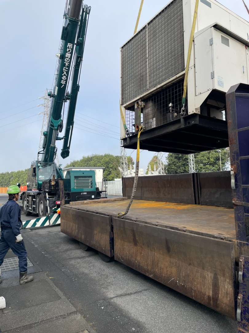 設置場所のすぐ背後には巨大な「水槽」や複雑な配管ラックが通っています。 このような環境での揚重作業(吊り上げ)は、少しの操作ミスが重大な設備破損につながります。 弊社では、経験豊富なオペレーターと合図者が連携し、周囲のインフラ設備に一切接触させないよう、数センチ単位のコントロールで慎重に旧設備の撤去と新設備の搬入を行いました。