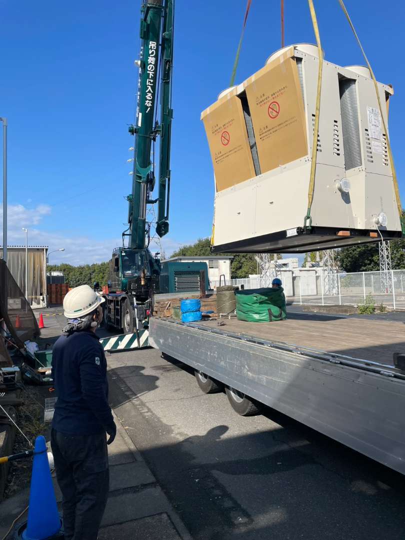 施工内容: 既設チラーの撤去、レッカーによる揚重作業、新規ユニットの搬入・設置レベル出し